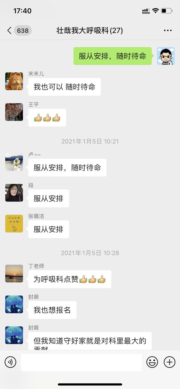 15日上午,呼吸内科接到我院抽调医护人员参与组建抗疫医疗队的任务,短短的几分钟内,科室微信群里请战的信息滚动刷屏。没有华丽的辞藻,没有空洞的口号,一句简单的“我报名”,体现了呼吸内科医护人员面对疫情无所畏惧、勇敢向前的亮剑精神。