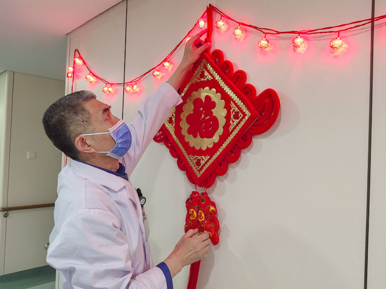 除夕当日,胸六科姚继方在科室挂“福”,把科室精心“装扮”。