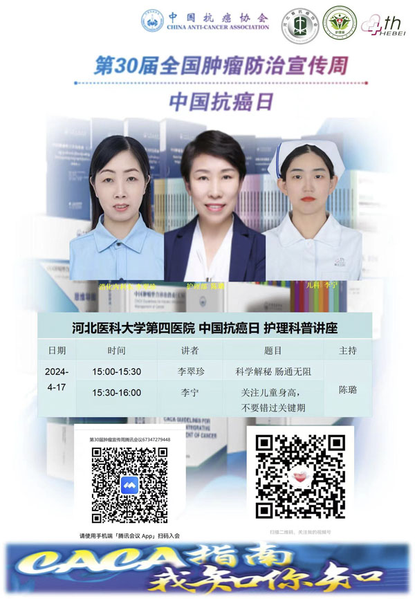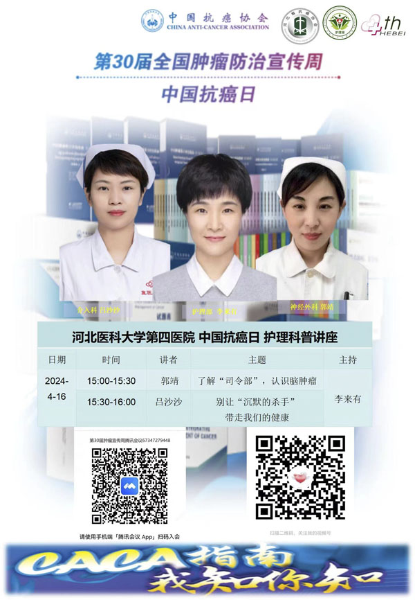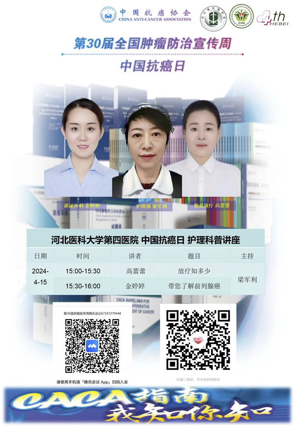 在第30个全国肿瘤防治宣传周期间,4月15-17日,河北省抗癌协会与我院护理部联合组织放疗科、泌尿外科、消化内科、儿科、神经外科、介入科等护理专家在线上进行系列科普讲座。