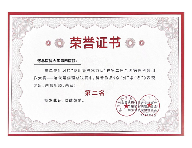 期间,全国第二届病理科普创作大赛“这就是病理”决赛举行,我院病理科派出的两支参赛队,从来自全国病理届科普精英的232份预赛作品中脱颖而出,凭借扎实的专业知识和颇具感染力的表演,展现了病理学的独特魅力,在全国总决赛分别获得全国第二名和第八名的好成绩,这也展示出我院病理科作为河北省科技厅肿瘤诊断科普示范基地的挂靠单位,具备较强的科普人才培养能力。