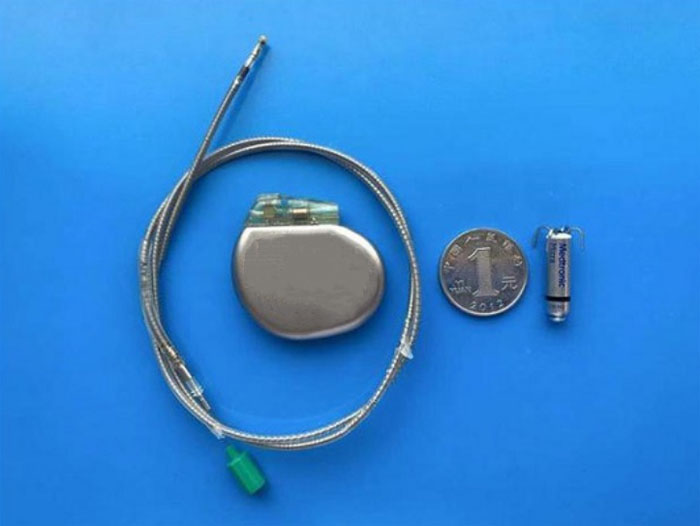 传统起搏器(左一)、Micra无导线起搏器(右一)大小