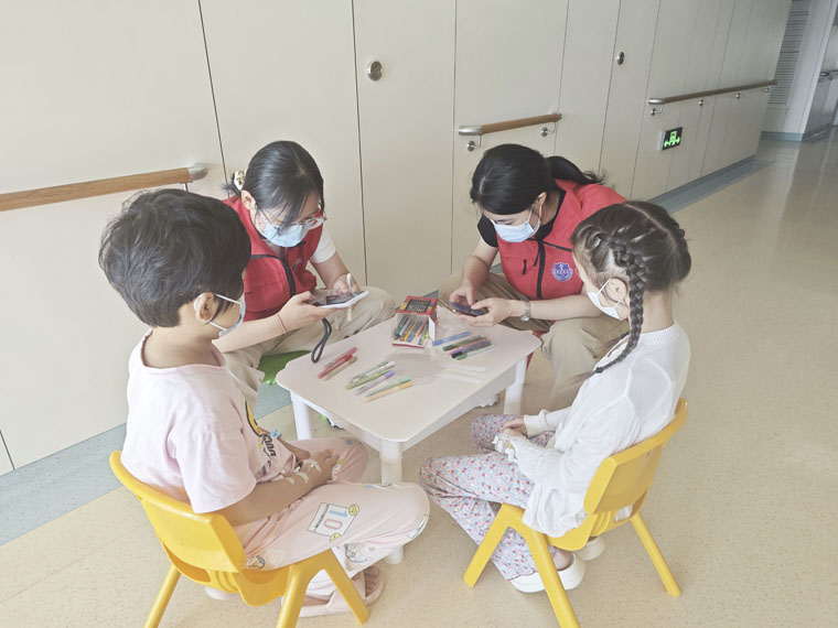 志愿者们精心准备了马克笔、透明圆扇及小贴画。儿科病区的部分小朋友在家长的陪同下,与志愿者们一起在扇子上描绘心中的美好场景,5岁的小女孩妞妞跟妈妈说,“这个医院真好呀!”卡哇伊的卡通人物、崇拜偶像的球衣、令人向往的美景……看着孩子们绘声绘色地讲述自己的作品,家长们脸上露出了欣慰的笑容。儿科主任刁玉巧表示,感谢大学生志愿者的积极参与,期待未来开展更多关注特殊儿童群体的主题活动,帮助住院患儿得到更好地治疗与呵护。
