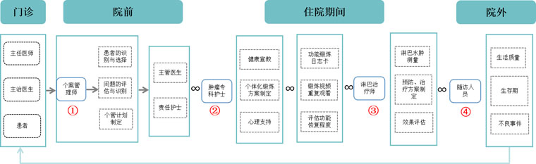 乳腺中心采用以责任护士为主导,个案管理师、肿瘤专科护士、淋巴水肿治疗师以及专业随访人员协同管理,为患者的治疗提供全方位保障。患者入院初期,个案管理师首先进行健康评估和风险筛查。责任护士在术前和术后分别进行全面的健康教育,并充分利用同伴教育(人们通常愿意听取年龄相仿、知识背景、兴趣爱好相近的同伴、朋友的意见和建议)优势,组织集体功能锻炼。当患者病情复杂多变时,责任护士及时与肿瘤专科护士、淋巴水肿治疗师沟通,量身定制个体化的功能锻炼方案。在多学科护理模式的支持下,乳腺癌患者患肢功能锻炼达标率由原来的81.20%上升至95.10%,显著提升了患者的康复效果,增强了大家战胜疾病的信心。
