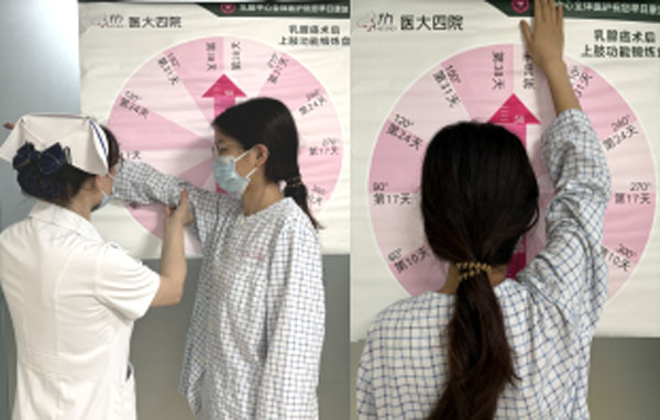 我院乳腺中心积极响应国家号召,持续推进“改善就医感受、提升患者体验”专项工作。科室针对乳腺疾病慢病管理现状,以乳腺癌患肢功能康复为支点,循证护理理论为指导,聚焦乳腺癌患肢(因手术等因素影响肢体活动,称为“患肢”)功能锻炼的细节管理与实施,开展多专业护理联动。目前形成了“三固定、两灵活”的管理模式,建立了院前、院内、院外一体化诊疗、护理、随访流程,致力于让患者就医的每一个环节更有温度。
