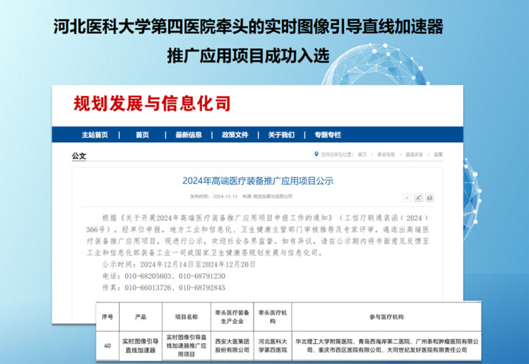 近日,工业和信息化部办公厅、国家卫生健康委办公厅联合发布了《2024年高端医疗装备推广应用项目公示》,共遴选出51项高端医疗装备推广应用项目,我院牵头的实时图像引导直线加速器推广应用项目成功入选。这项工作旨在面向典型应用场景,遴选一批高端医疗装备技术创新与临床应用水平处于全国前列,对高端医疗装备医工协同创新、中试验证、临床研究、迭代升级与推广应用等具有较强引领带动作用的项目。