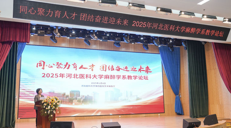 1月4日,河北医科大学麻醉学系在我院新医技病房楼报告厅举办了2025年教学论坛暨新年联欢会。本次论坛的主题为“同心聚力育人才,团结奋进迎未来”。河北医科大学党委副书记武宇明、我院党委书记李立平、副院长田晓玲,以及来自北京大学第三医院麻醉科主任郭向阳、天津医科大学总医院麻醉科主任于泳浩、天津医科大学第二医院麻醉科主任卢悦淳等多位麻醉领域专家学者出席会议。