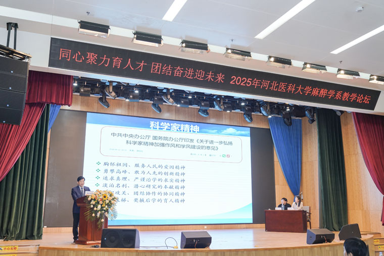 学校党委副书记武宇明在会上代表学校向关心和支持麻醉学专业发展的各位嘉宾表达了诚挚的感谢。她强调,河北医科大学麻醉学系是一支充满情怀、勇于担当、具备能力的教学团队,从老前辈张立生教授创办麻醉学专业教育开始,传承发扬,历经几代人的不懈努力,为国家培养了3000多名合格的麻醉学本科毕业生,遍布全国30多个省、自治区、直辖市,为推进健康河北、健康中国建设提供了坚实的人才支持和医疗保障。特别是去年11月,学校举办的麻醉学专业本科教育30周年庆典活动,进一步扩大了学科的影响力,对于传承麻醉学专业的优良传统,弘扬人民至上、生命至上的崇高精神,守护人民群众的生命健康产生了深远的影响。