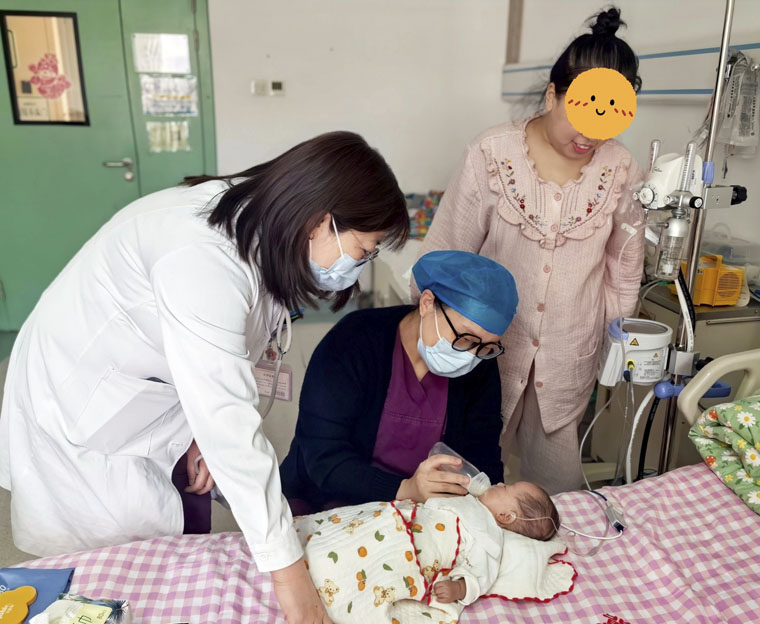 在新生儿病区,两个出生时仅25周的超早产儿,因支气管肺发育不良,不能离氧,需要医护人员实时监测看护。由于吃奶不协调,为防治出现呛奶造成窒息,从NICU转入母婴同室后,医护人员陪伴着宝宝和家长,配奶、喂奶、喂药、换尿布……每一个环节严格把控,耐心指导。在大家的共同努力下,两个宝宝平安度过了春节,体重增长良好。