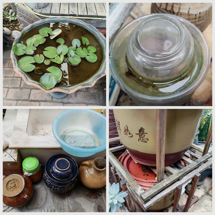 (三)天台、阳台及门前屋后积水管理。屋顶反墚、排水槽等应定期疏通,避免堵塞积水。阳台、天台、庭院内的花盆、泡沫箱、废弃瓶罐等容器应及时清理,闲置容器应倒扣放置,储水容器如水缸应加盖,废弃容器彻底清除。竹筒、树洞应进行封堵或改造,莲花池养鱼防蚊。空调冷凝水应及时排净,废弃轮胎在底部打孔或避免露天放置。下水井进行防蚊封堵,有条件的建议将明沟改为暗渠。