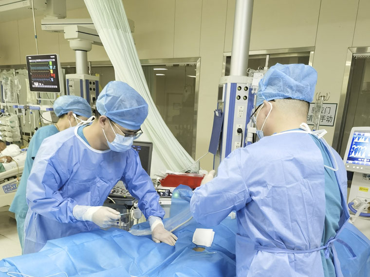面对急危情况,重症医学科团队迅速启动应急响应机制。体外膜肺氧合技术(ECMO)小组在胡振杰教授的指导下,顺利为患者实施(VA-ECMO)静脉-动脉体外膜肺氧合置管术。该技术是一种生命支持技术,通过将患者体内的静脉血引出体外,经过体外氧合器氧合、去除二氧化碳等处理后,再泵回病人体内,起到呼吸及循环支持的作用,为后续治疗赢得关键时间窗口。众所周知,术后高危肺栓塞治疗困难极大,该例患者为大手术后第一天,溶栓治疗是禁忌症,同时也没有取栓的适应症,因此,在积极抗凝治疗基础上通过ECMO稳定患者的呼吸及循环功能,保证重要器官的氧供,为患者打开了通向“新生”的通道。经过4天的生死博弈,患者的呼吸、循环逐渐稳定下来,肺动脉压明显下降,顺利撤离ECMO。