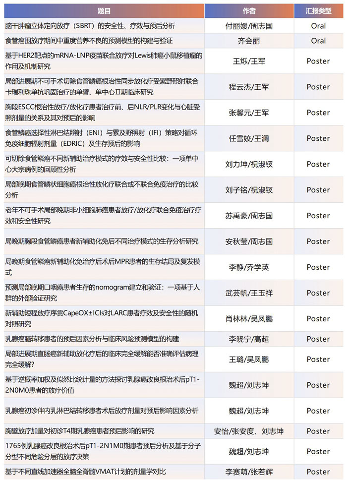 中华医学会放射肿瘤治疗学学术会议作为我国放射肿瘤治疗领域的顶级学术盛会之一,汇聚了全国医疗机构及科研单位的专家学者,旨在展示前沿研究成果,推动放射肿瘤治疗技术创新与临床应用深度融合。本次公布的我院研究成果涵盖食管癌、肺癌、乳腺癌、头颈部肿瘤、直肠癌、妇科肿瘤及放疗技术应用等多个关键领域,其中2项研究被选为大会口头发言,18项成果以poster形式展示,56项成果通过书面交流形式分享,全面展现了科室在临床与科研领域的多维突破。