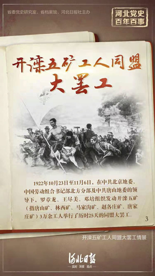 1922年10月23日,在中共北京地委、中国劳动组合书记部北方分部及中共唐山地委的领导下,罗章龙、王尽美、邓培组织发动开滦五矿(指唐山矿、林西矿、马家沟矿、赵各庄矿、唐家庄矿)3万余工人举行了历时25天的同盟大罢工。此次罢工虽然在中外反动派的联合镇压下没有达到预期的目的,但在国内外产生了重大的影响。