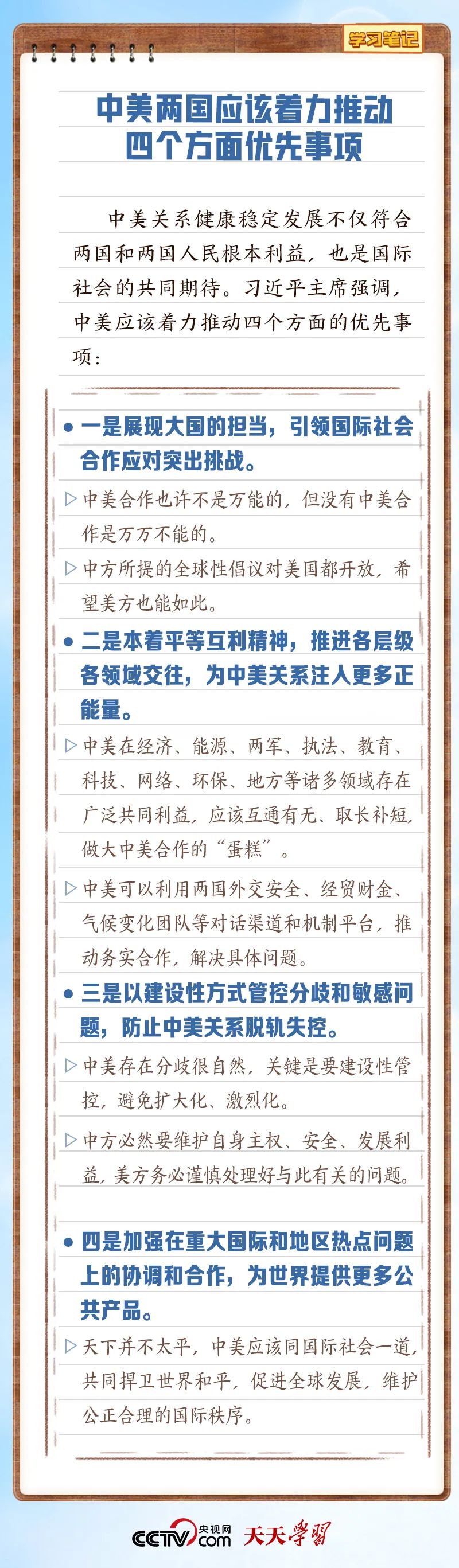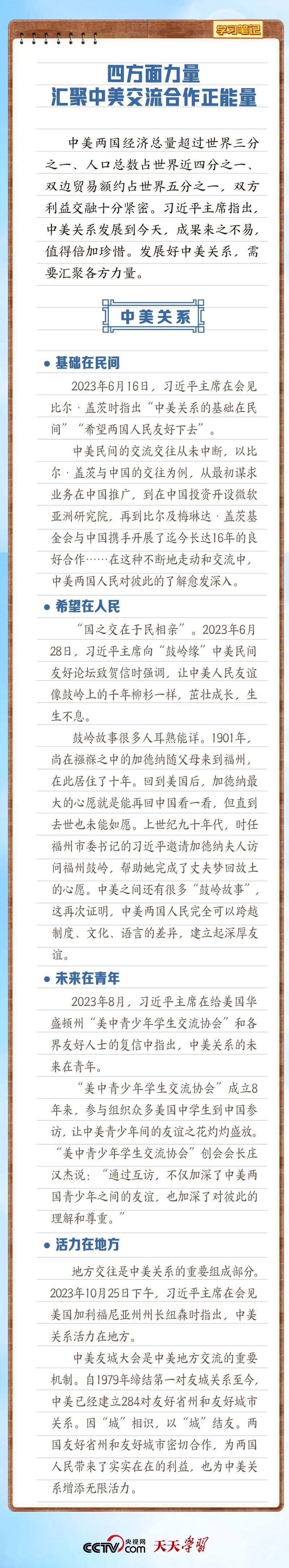 “中美两国从建交到现在,可以说打了半个多世纪的交道,也经历了不少的风雨,但是大的方向还是朝前走。世界在发展,时代在变化,但中美两国和平共处的历史逻辑没有改变,两国人民希望交流合作的根本愿望没有变,国际社会对中美关系稳定发展的普遍期待没有变。”