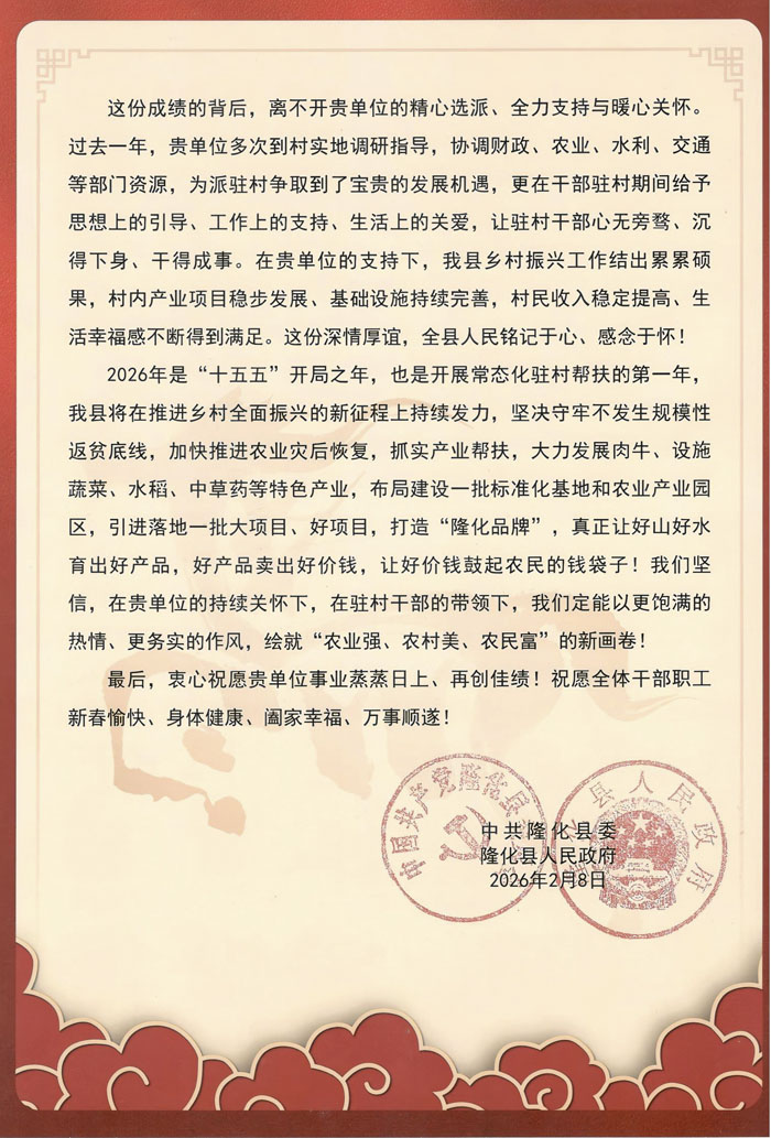 2月13日,我院党委收到来自中共隆化县委隆化县人民政府的一封感谢信,信中高度肯定我院驻村干部在产业振兴、民生福祉、基层党建等方面的突出贡献,提到驻村干部立足村情实际,用脚步丈量民情,用实干书写担当,用真心温暖民心,成为了乡村发展的“领头雁”、群众信赖的“贴心人”。信中还指出,我院协调争取的财政、农业、水利、交通等多部门资源支持,为隆化县乡村振兴注入了强劲动能,推动村级产业项目落地见效、基础设施提档升级、群众增收渠道持续拓宽。